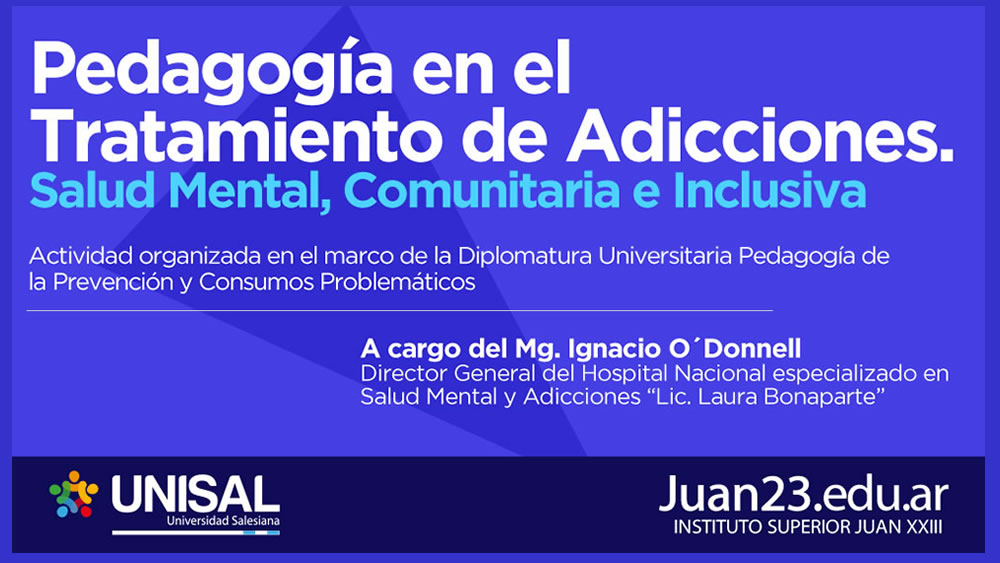 La charla āPedagogĆa en el tratamiento de las adicciones: salud mental, comunitaria e inclusivaā se llevarĆ” a cabo el viernes 13 de septiembre en al aula magna del Instituto Juan23, Vieytes 286, en el horario de 15:30 a 17:30.