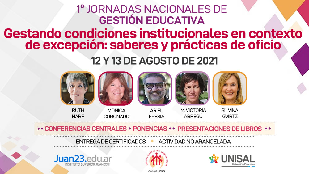 Se llevará a cabo el jueves 12 y viernes 13 de agosto la primera edición de las Jornadas Nacionales de Gestión Educativa: “Gestando condiciones institucionales en contexto de excepción: saberes y prácticas de oficio”. Son organizadas por la Casa Salesiana de Educación Superior (Instituto Superior Juan 23 – Universidad Salesiana).