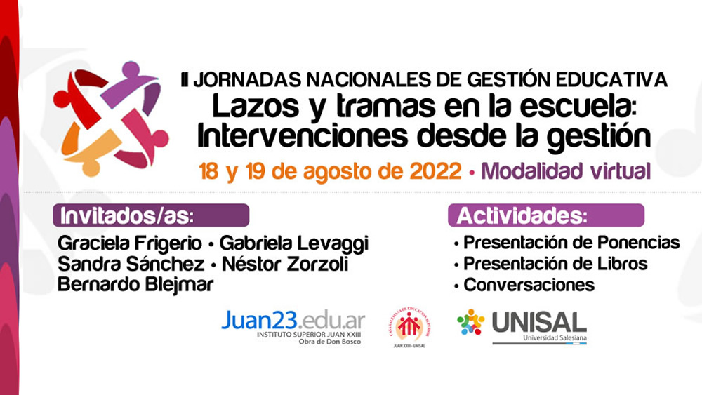 Se llevará a cabo el jueves 18 y viernes 19 de agosto la segunda edición de las Jornadas Nacionales de Gestión Educativa: “Lazos y tramas en la escuela: Intervenciones desde la gestión”. Son organizadas por la Casa Salesiana de Educación Superior (Instituto Superior Juan 23 – Universidad Salesiana).