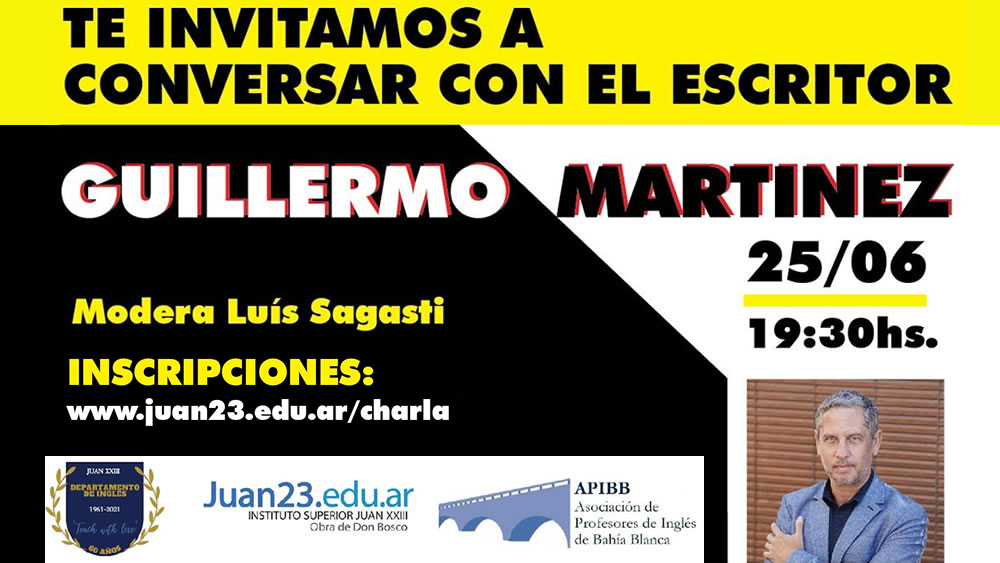 El escritor bahiense Guillermo Martínez dará una charla abierta el próximo viernes 25 de junio a las 19:30. Contará con la moderación de Luis Sagasti y es organizada por el Departamento de Inglés del Instituto Superior Juan 23 dentro de las actividades que lleva a cabo por su 60º aniversario, junto a la Asociación de Profesores de Inglés de Bahía Blanca.