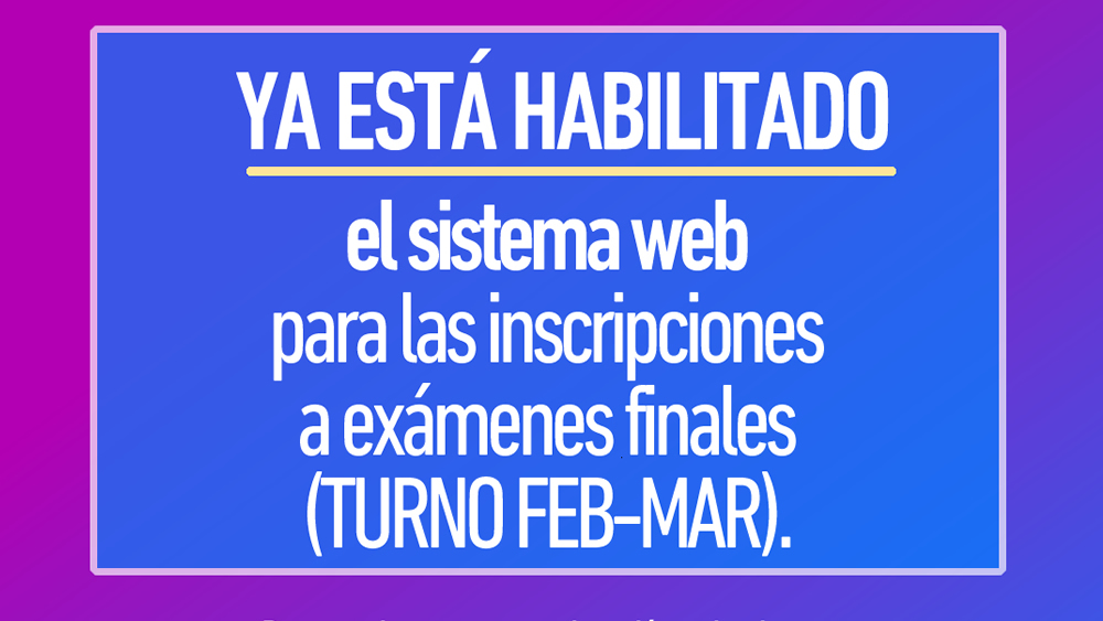 Se encuentra habilitado el sistema web para la inscripción a los exĆ”menes finales. PodrĆ”s hacerlo ingresando en www.Juan23.edu.ar Ā«Autogestión EstudiantesĀ». RecordĆ” que la inscripción puede ser hasta 48 hs hĆ”biles antes de cada final (sin contar el dĆa del examen ni el dĆa de inscripción), y es necesario tener aprobado el cursado de la materia y la acreditación de sus correlativas.