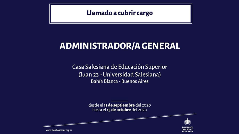 Del 11 de septiembre al 15 de octubre está abierto el proceso de convocatoria y selección de aspirantes para la cobertura ADMINISTRADOR/A de la CASA SALESIANA de EDUCACIÓN SUPERIOR (Juan23-Unisal).