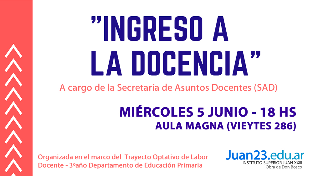 Ese es el nombre de la charla que se desarrollará el miércoles 5 de junio, a partir de las 18 hs en el aula magna del Instituto, donde se brindará información sobre el ingreso a docencia de gestión estatal. Estará a cargo de la Secretaría de Asuntos Docentes (SAD).
