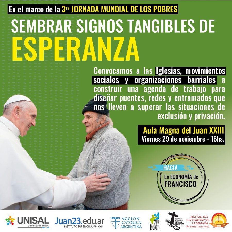 En el marco de la 3ra Jornada Mundial de los Pobres, convocada por el Papa Francisco, convocamos a las Iglesias, movimientos sociales y organizaciones barriales a construir una agenda de trabajo para diseñar puentes, redes y entramados que nos lleven a superar las situaciones de exclusión y privación.